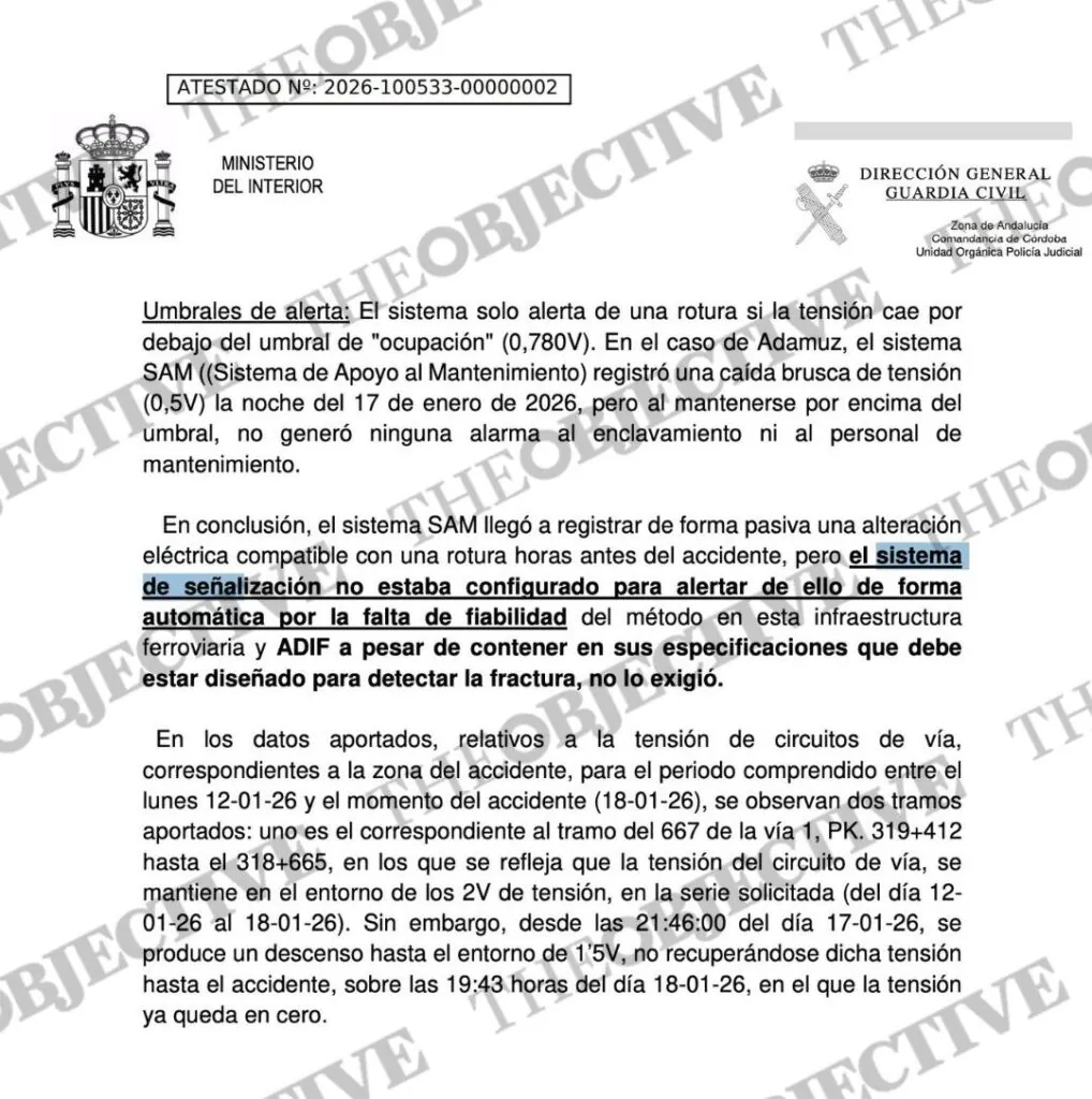 El último informe de la investigación de la Guardia Civil sobre el accidente ferroviario de Adamuz (Córdoba) que causó la muerte de 46 personas señala que no se pudo detectar la rotura de la vía, ocurrida el día anterior, debido a que el sistema de alerta no estaba preparado para ello, a pesar de que se constató una bajada de tensión en la zona del accidente, tal y como ya adelantó THE OBJECTIVE hace casi un mes, el pasado 16 de marzo.