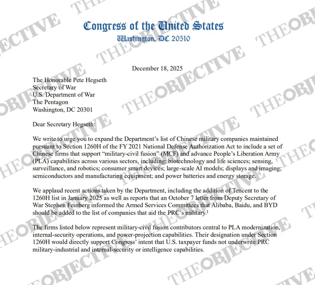 La carta de los congresistas estadounidenses, a la que ha tenido acceso THE OBJECTIVE, está firmada por miembros del comité de China, de Inteligencia, de Seguridad Nacional, de Asuntos Exteriores y del subcomité de la NSA. algunas de las principales entidades políticas de Estados Unidos en materia de seguridad nacional. El aviso fue remitido el pasado 18 de diciembre al secretario de Guerra de Donald Trump, Pete Hegseth.
