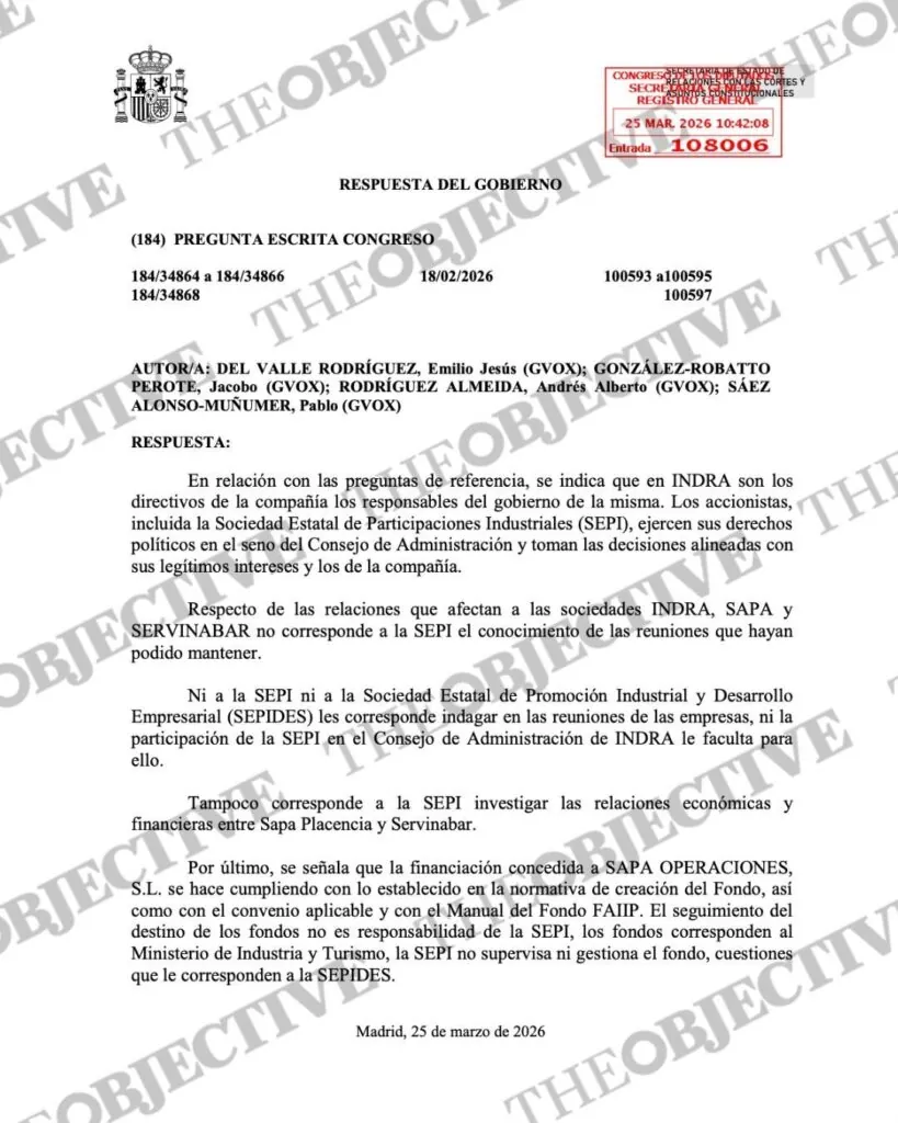 La aclaración del Gobierno llega tras una batería de preguntas registradas en el Congreso por diputados de Vox, a las que ha tenido acceso THE OBJECTIVE, que ponen el foco en la relación entre Indra, SAPA Placencia y Servinabar. El origen de la iniciativa se sitúa en un préstamo público de 47 millones de euros concedido a SAPA a través de instrumentos estatales, así como en las informaciones que apuntan a posibles pagos posteriores de esta compañía a terceros.
