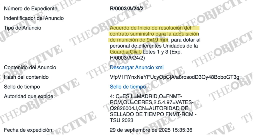 El Ministerio del Interior ha tardado casi un año en volver a poner en marcha el contrato de munición de arma corta para la Guardia Civil que procedió a suspender cuando sus socios le presionaron para ello. La adjudicación a la empresa Guardian Defence & Homeland Security —en representación de la firma israelí IMI Systems LTD— se firmó en plena Semana Santa de 2025 y posteriormente se anunció su anulación, pero el expediente se mantuvo activo durante meses. Concretamente, hasta el 29 de septiembre, cuando se inició un procedimiento para la resolución del contrato «por imposible cumplimiento» para adquirir 15 millones de balas para la Guardia Civil por un valor estimado de 6,8 millones.