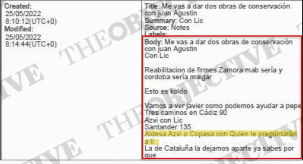Según entienden los investigadores, esta nota gira en torno a una frase de esa conversación, en la que se dice textualmente «vamos a ver javier como podemos ayudar a pepe [sic]», en relación al constructor Pepe Ruz. Ahí se establecen varias menciones a obras como «Cádiz 90» o «Santander 135», lo que podrían ser ubicaciones e importes en millones de esas obras. En ese momento, Koldo señala: «Aldesa Azvi o Copasa con Quien te preguntarán a ti [sic]», en lo que parece ser una mención a empresas con las que se podría hacer una unión temporal de empresas (UTE) para acceder a dicha adjudicación.