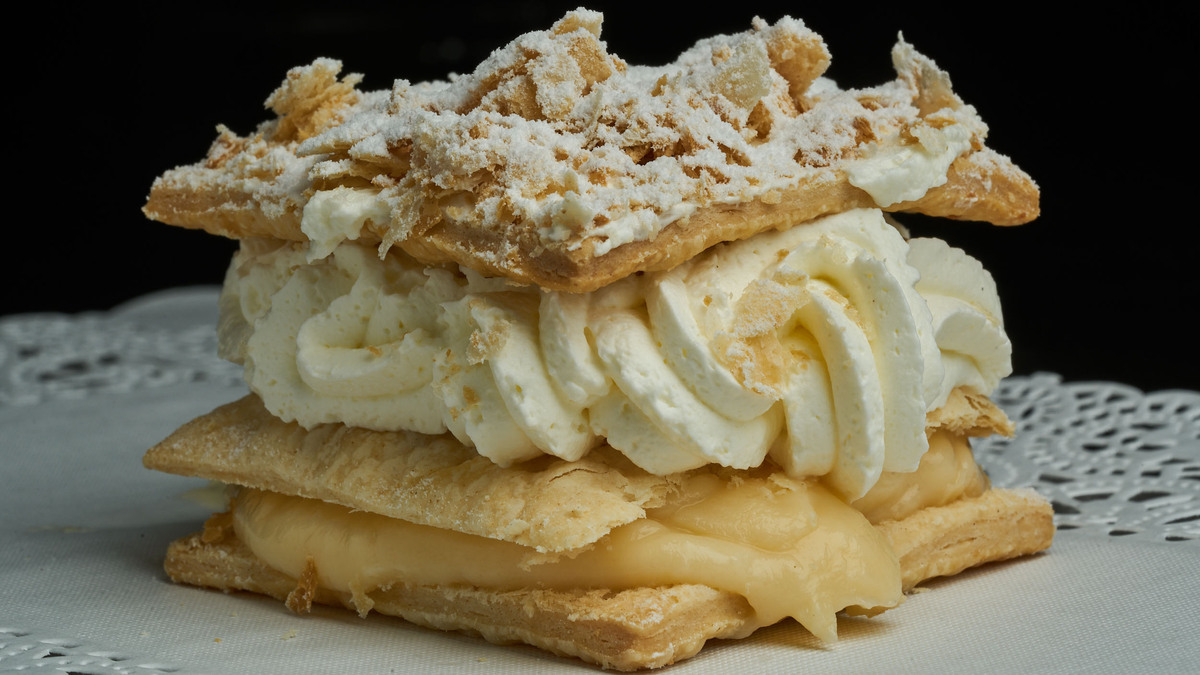 Tarta de milhojas rellena de nata y crema. | ASEC