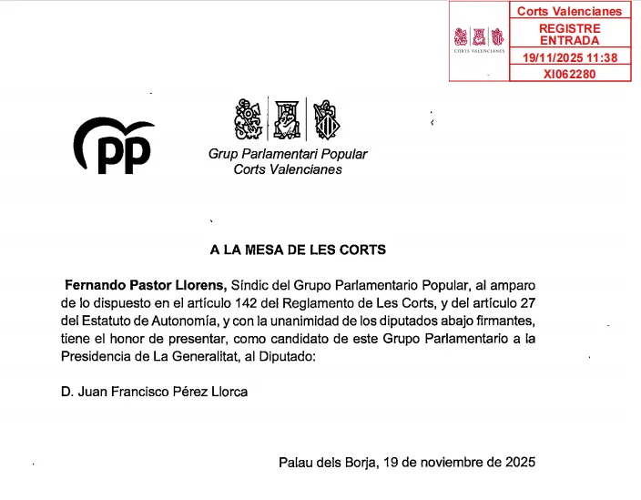 Juanfran Pérez Llorca ha formalizado este miércoles por la mañana su candidatura oficial para convertirse en el octavo president de la Generalitat valenciana. Es un movimiento decisivo del PP, que da así un paso al frente antes de haber cerrado completamente el acuerdo de investidura con Vox. El registro de la candidatura, tramitado por el nuevo síndico popular, Fernando Pastor, confirma que la sucesión tras la dimisión de Carlos Mazón entra ya en su recta final, aunque las negociaciones entre los dos partidos continúan abiertas.