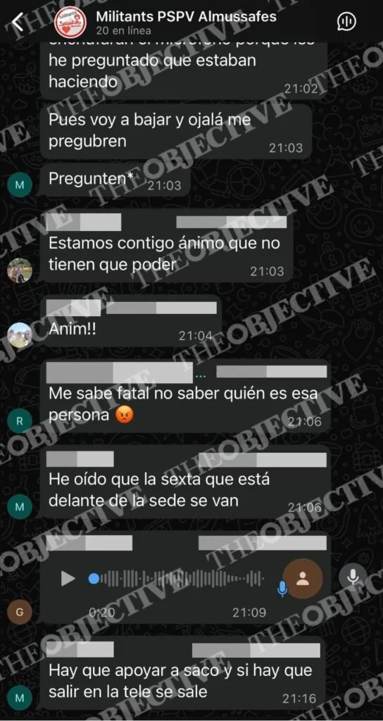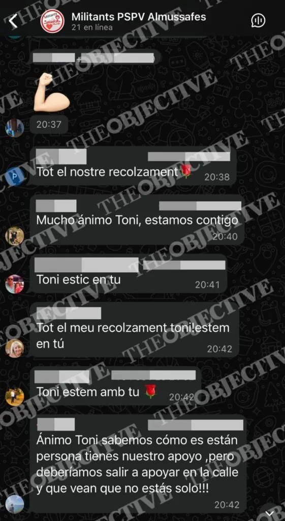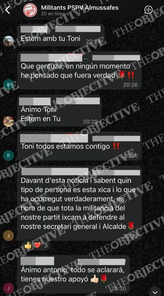 En los chats internos del PSOE de Almusafes, a los que ha tenido acceso THE OBJECTIVE, la mujer es descrita como «tiparraca», «gentuza» y «mala persona», mientras se anima a la militancia a defender públicamente al dirigente socialista denunciado. «Es hora de que toda la militancia salgamos a defender a nuestro secretario general y al alcalde», se lee en uno de los mensajes. En otro: «Mucho ánimo, Toni, estamos contigo». Incluso aparece el conocido lema feminista invertido que resume el clima interno: «Yo sí te creo, Toni».