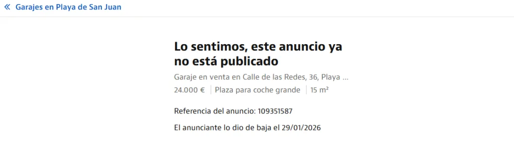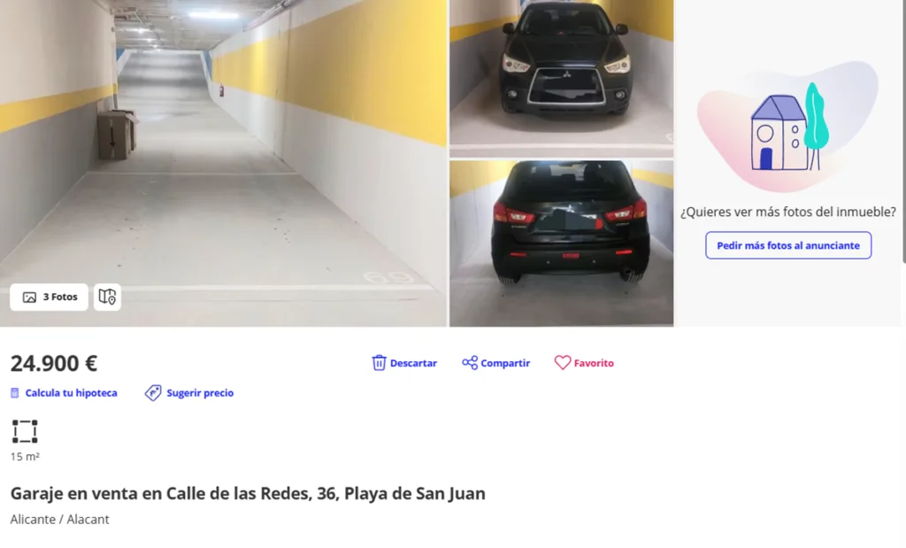 Estos son algunos de los mensajes que pueden leerse en portales inmobiliarios. En anuncios de alquiler se describe: «Plaza de garaje amplia con capacidad para un coche grande y para una moto. De fácil acceso y maniobrabilidad en urbanización de obra nueva» o «Plaza de garaje en la Urbanización Les Naus, situada en la calle Redes, 36. Espacio cómodo con puerta automática y excelente seguridad. Ubicación inmejorable y fácil acceso peatonal». En un anuncio de venta se indica: «Vendo plaza de garaje al lado del Colegio El Valle. Entre Historiador Vicente Ramos y calle Redes. Aparcamiento en sótano 2. Plaza grande y fácil de maniobrar».