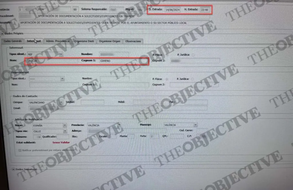 THE OBJECTIVE ha podido verificar que Alicia Gimeno no había completado su candidatura a la plaza municipal dentro del plazo inicial. Tanto ella como Manuela Gras concurrieron también a dichas convocatorias. En el caso de Gimeno, su solicitud quedó registrada apenas una hora y veinte minutos antes de que expirara el plazo ampliado —a las 22:40—, tal y como se aprecia en la imagen inferior.