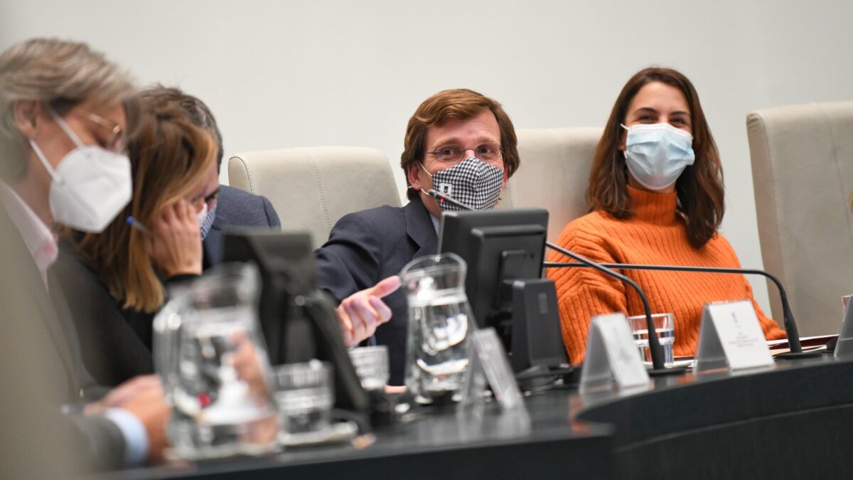 El portavoz nacional del PP y alcalde de Madrid, José Luis Martínez-Almeida, y la portavoz de Más Madrid en el Ayuntamiento, Rita Maestre, durante un Pleno de la Infancia | Fernando Sánchez (Europa Press)