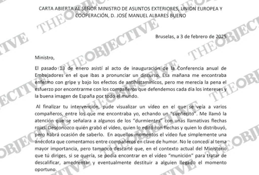 En la dura misiva al ministro, a la que ha tenido acceso THE OBJECTIVE, el diplomático acusa a Albares de «sembrar la