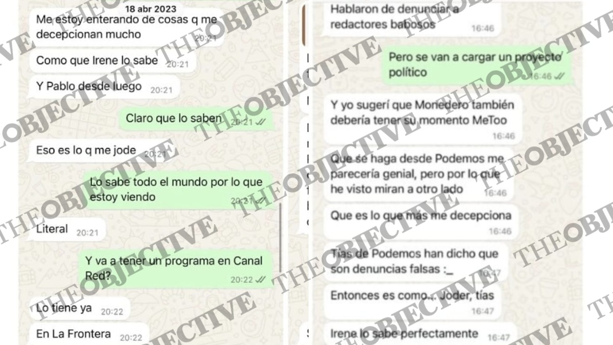 «Tías de Podemos han dicho que son denuncias falsas. Entonces es como… joder», mantiene en la conversación y acto seguido se refiere a otra colaboradora de la televisión de Iglesias, Inna Afinogenova («la Inna dijo que son denuncias falsas»). Y añade para aclarar que también altos cargos del partido habrían estado al tanto: «Irene lo sabe perfectamente. Y mira que la admiro». Y agrega: «Y Pablo desde luego».