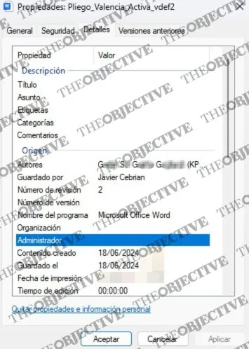 THE OBJECTIVE ha tenido acceso a documentos que revelan que la base del pliego de la campaña de publicidad para promocionar Valencia Activa, una entidad pública municipal dirigida por el propio Badenas, fue cocinada por Imedes. Esta empresa preparó el 18 de junio una propuesta de licitación en un documento en Word que el marido de Bernabé, Javier Cebrián, entregó en mano el día 21 de ese mes en las mismas dependencias del Ayuntamiento de Valencia. Los metadatos del documento llamado ‘Pliego_Valencia_Activa_vdef2’ delatan al esposo de la delegada socialista del Gobierno, ya que aparece como la última persona que lo manipuló el día 18 en su versión definitiva (ver abajo).