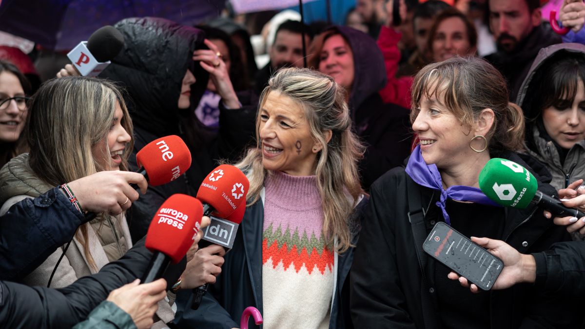 Yolanda Díaz atiende a los medios durante la manifestación del 8M. | Diego Radamés, Europa Press