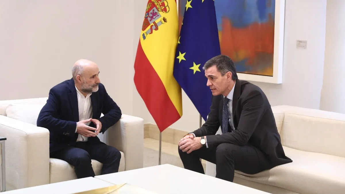 El presidente del Gobierno, Pedro Sánchez, recibe al portavoz del BNG en el Congreso, Néstor Rego, en el Palacio de la Moncloa.