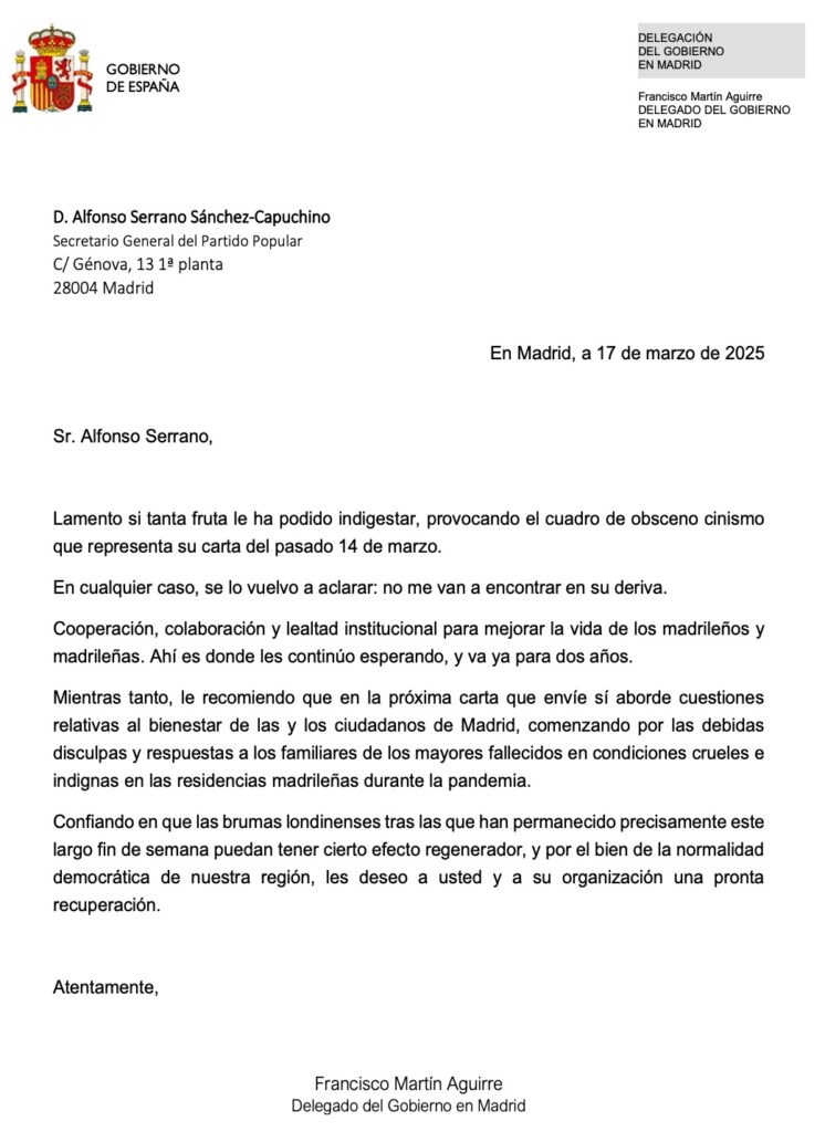 “Lamento si tanta fruta le ha podido indigestar, provocando el cuadro de obsceno cinismo que representa su carta del pasado 14 de marzo. En cualquier caso, se lo vuelvo a aclarar: no me van a encontrar en su deriva. Cooperación, colaboración y lealtad institucional para mejorar la vida de los madrileños y madrileñas. Ahí es donde les continúo esperando, y va ya para dos años”, le ha respondido hoy el delegado del Gobierno.