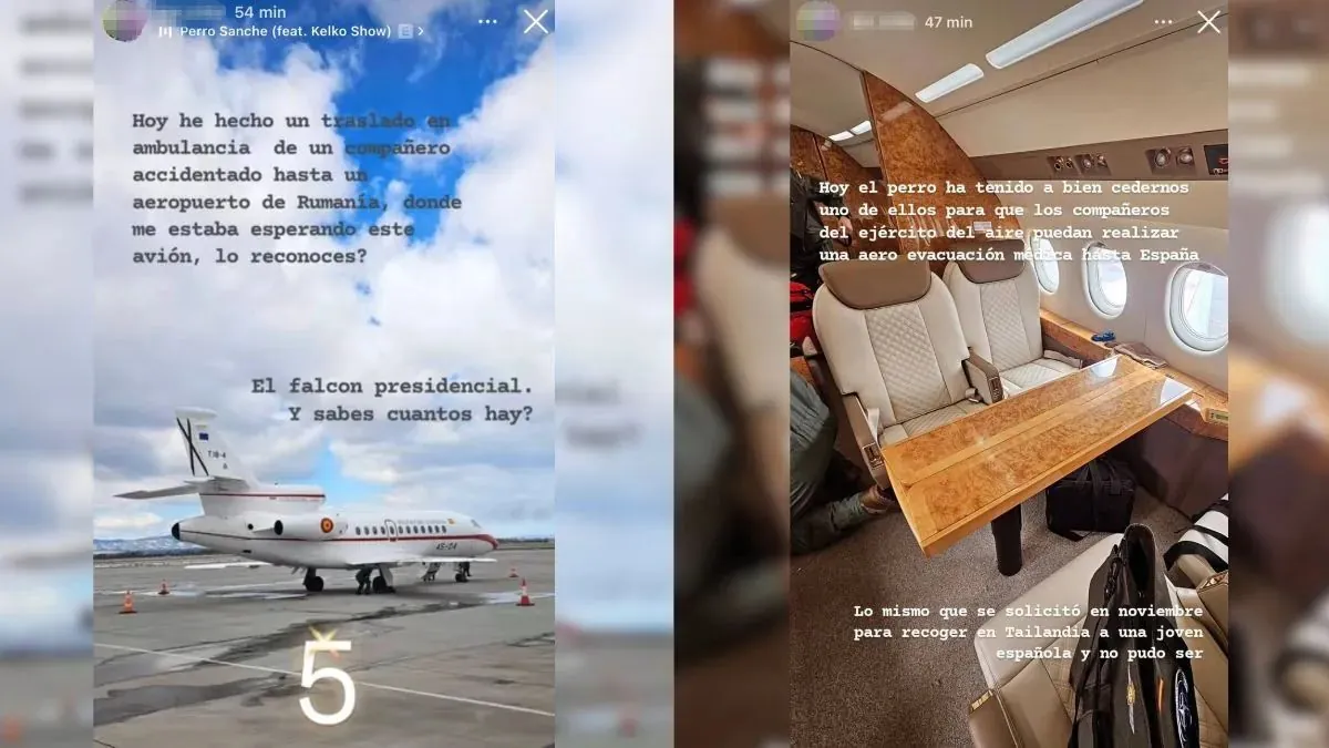 «Hoy he hecho un traslado en ambulancia de un compañero accidentado hasta un aeropuerto de Rumanía, donde me estaba esperando este avión, ¿lo reconoces? Es el Falcon presidencial, ¿y sabes cuántos hay?», señala el militar en su primera imagen subida a su Instagram. «Hoy el perro ha tenido a bien cedernos uno de ellos para que los compañeros del Ejército del Aire puedan realizar una aeroevacuación médica hasta España. Lo mismo que se solicitó en noviembre para recoger en Tailandia a una joven español y no pudo ser», prosigue refiriéndose al caso de la joven Ángela Aguado, que quedó en coma el 6 de octubre tras sufrir un accidente de moto, y que solo pudo regresar a España unas semanas después de que sus familiares y amigos de Godelleta (Valencia) recolectasen 300.000 euros. El Ministerio de Defensa se negó a movilizar a la Umaer para dicho traslado.
