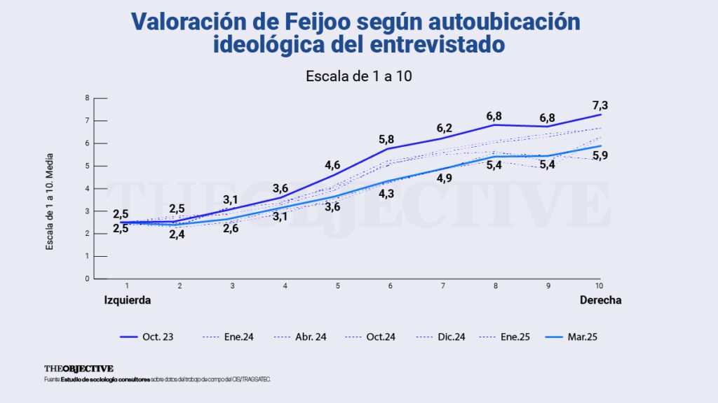 En el caso de Feijoo, el paso y desgaste de los meses se recoge en el gráfico siguiente. Los números corresponden a la puntuación media de los entrevistados que se sitúan en cada punto del eje izquierda-derecha, en octubre-23 y marzo-25, las líneas intermedias son los demás meses de la leyenda. El progresivo descenso es evidente:
