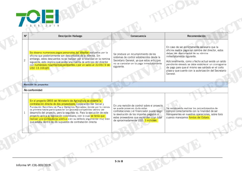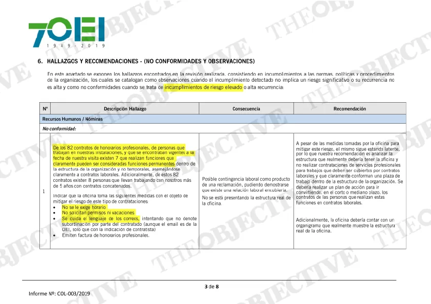 La primera corrió a cargo de la auditora de la Organización, María Elena Laprea Jerez, con fecha de 9 de julio de 2019, tras varios requerimientos de información a Ángel Peccis, a quien se le remitió el documento interno al que ha tenido acceso THE OBJECTIVE en el que se plasmaron numerosos «incumplimientos de riesgo elevado». El primero de ellos, en el departamento de Recursos Humanos de la oficina: «De los 82 contratos de honorarios profesionales, de personas que trabajan en nuestras instalaciones y que se encontraban vigentes a la fecha de nuestra visita» sólo siete «realizan funciones permanentes», y otros ocho que «llevan más de 5 años con contratos concatenados».