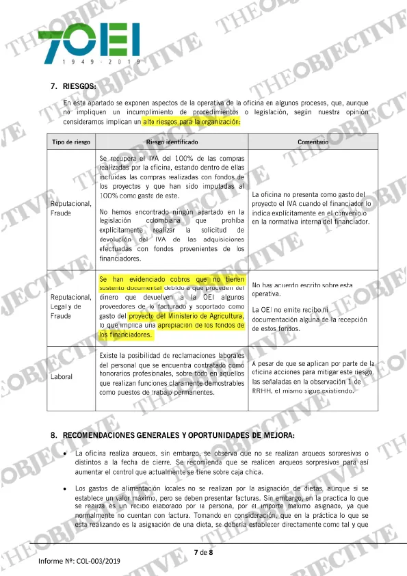 A modo de conclusiones, la auditoría interna alerta de los «altos riesgos para la organización» y reporta fraudes en la recuperación del Impuesto del Valor Añadido (IVA), que está exento en los proyectos de cooperación. Pero también alertaba de posibles irregularidades en torno a proyectos «que no tienen sustento documental». Hace referencia el informe al citado proyecto del Ministerio de Agricultura, del que llama la atención porque «no hay acuerdo suscrito sobre esta operativa». Y apunta a que podría implicar una «apropiación de los fondos de los financiadores».