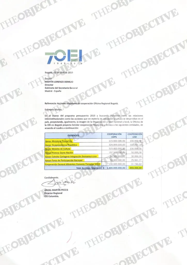 A modo de respuesta, el director de la oficina colombiana remitió un informe desglosando las diferentes partidas de «cooperación financiera» que la OEI en Bogotá ofrecía a diferentes entidades «en materia de educación y cultura». A los diferentes «apoyos» (al «Ministerio de Educación», «Vicepresidenta República», «Primera Dama Nación», y «Ministra de Cultura»), se le sumó una suma de 30.000 dólares al «Apoyo a la Cátedra Cartagena Integración Iberoamericana». Una cátedra promovida por el propio Samper y que se presentó en la Casa de América de Madrid el 26 de octubre de 2018, con la presencia del expresidente colombiano, el representante de la OEI y el expresidente del Gobierno José Luis Rodríguez Zapatero.