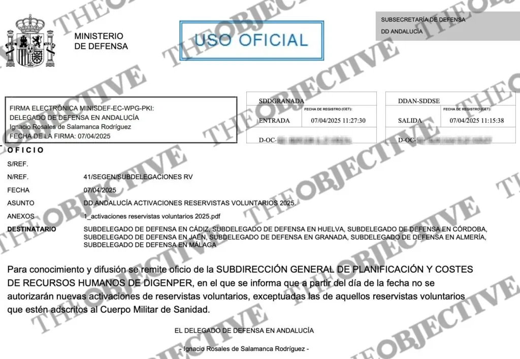 La delegación del Ministerio de Defensa en Andalucía distribuyó el 7 de abril a las 11.15 horas un oficio entre sus delegados provinciales (ver abajo), en el que les anuncia que la Subdirección General de Planificación y Costes de Recursos Humanos, dependiente de la Dirección General de Personal, ha ordenado que a partir de ese día «no se autorizan nuevas activaciones de reservistas voluntarios, exceptuadas las de aquellos reservistas voluntarios que estén adscritos al Cuerpo Militar de Sanidad».