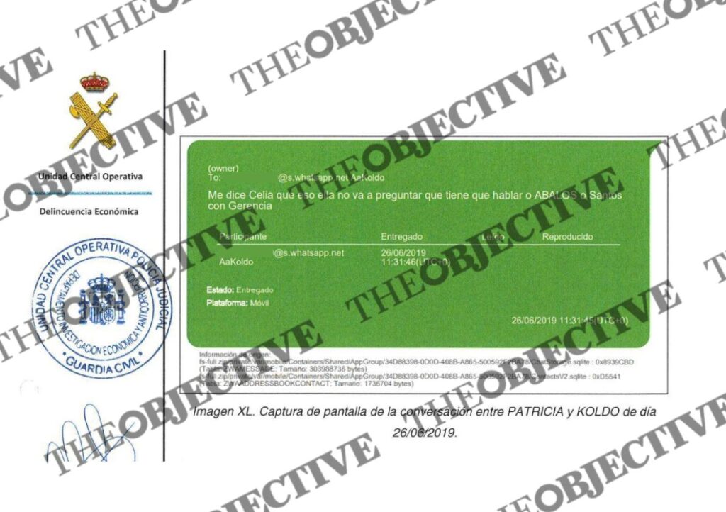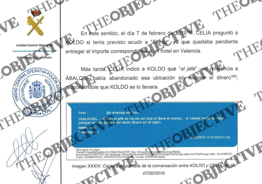 Según los investigadores del Instituto Armado, se trata de una comunicación «nuevamente llamativa» porque supone una «referencia expresa a la necesidad de que Ábalos o Santos mediaran para el pago de una cantidad en efectivo con cargo a la caja del PSOE». La UCO vuelve a citar en la causa ya extinta sobre la querella de Ábalos contra THE OBJECTIVE en la declaración testifical que realizó Santos Cerdán, a petición del querellante y donde negó cualquier responsabilidad en la gestión de facturas o gastos del PSOE: «Yo no tenía ninguna responsabilidad, ni con las facturas, ni con los gastos, y, evidentemente el señor Ábalos en el seno de la Secretaría de Organización era superior a mi cargo y yo no tenía ninguna responsabilidad».