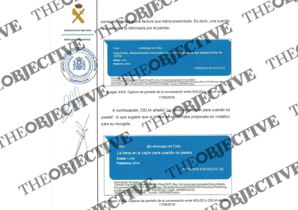 A sumar, además, el cruce de mensajes entre Koldo García, su mujer y la propia Celia. La trabajadora de secretaría del PSOE le envió el 7 de septiembre de 2018 un mensaje a Koldo en referencia a Covadonga San Pedro Pascual, la segunda secretaria de la Organización del PSOE: «Hola Koldo, efectivamente Cova cobró el miércoles pasado la que estaba hecha de 1.020 euros. La tiene en el cajón para cuando os paséis». Cinco meses después aparece un mensaje similar. El 7 de febrero de 2019, Celia Rodríguez envía un mensaje a Koldo sobre si tenía previsto acudir a Ferraz para recoger el sobre que el «jefe» (por Ábalos) se había olvidado: «Hola Koldo… al final el jefe se ha ido sin que le diera el money… si vienes mañana mejor, porque no me gusta tener tanto dinero en el cajón». Al día siguiente, Patricia le comentó a Koldo: «Voy para Ferraz a recoger el sobre en coche y luego me llevan a casa».