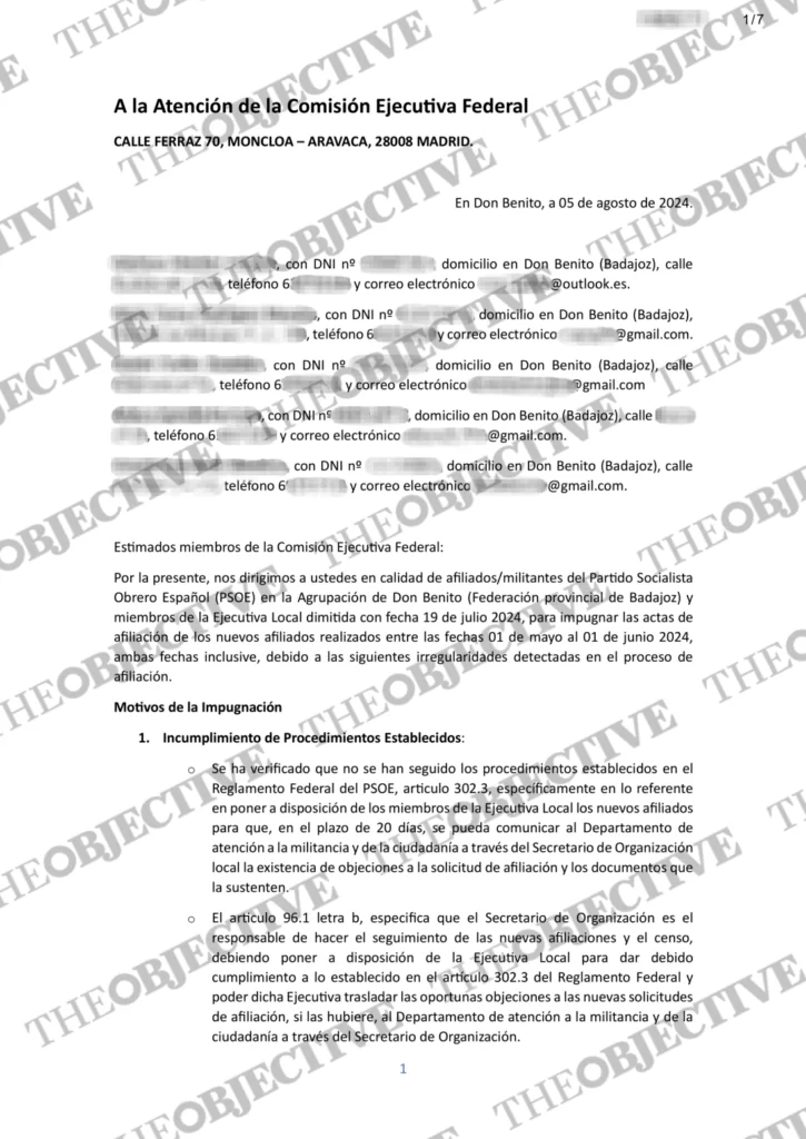 En dicho escrito de queja, este grupo de afiliados pidió a Ferraz que hiciese «una revisión exhaustiva» de las incorporaciones en Don Benito entre el 1 de mayo y el 1 de junio del año pasado, y que en caso de confirmar «las irregularidades denunciadas», procediese a la anulación de dichas afiliaciones. «Esperamos que esta impugnación sea considerada con la diligencia y seriedad que merece para salvaguardar la integridad y transparencia del proceso de afiliación del Partido», concluyeron los firmantes en la misma línea que ahora Dávila. Pero desde Madrid solo recibieron desdén y silencio.