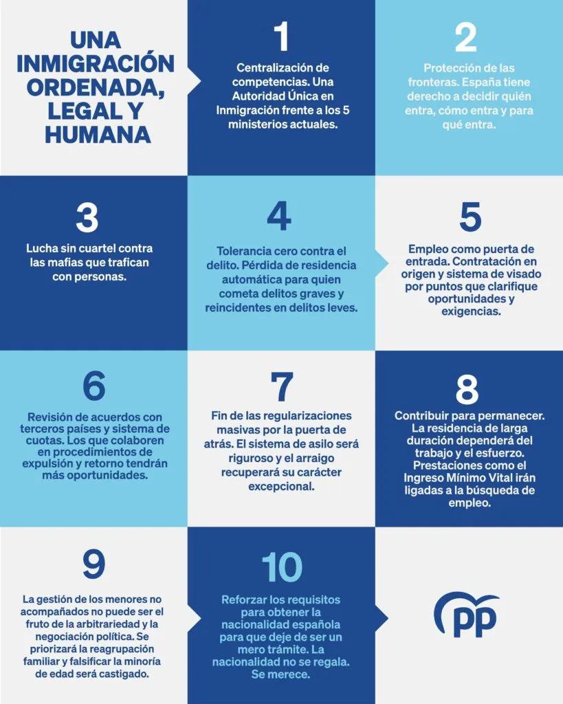 Feijóo ha defendido que el PP no esconderá sus propuestas en inmigración por miedo a lo que digan, y ha afirmado que el PP ofrece «principios sólidos que ni se entregan al buenismo del Gobierno ni a fomentar una criminalización del migrante, como cree que defiende Vox, porque no se soluciona nada». Además, ha recalcado que nunca defenderán una política migratoria «que convierta barrios enteros en lugares irreconocibles» y que su propuesta tiene como objetivo propiciar la inmigración «ordenada, legal y humana».