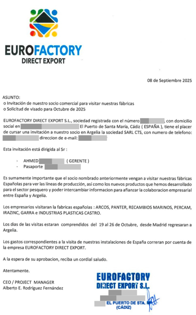 «Estoy jodido porque necesito trabajar y si no recibo las visitas de los empresarios argelinos, mi modelo de negocio se bloquea. Estoy trabajando al 10% por culpa del consulado, pero seguiré luchando mientras que pueda. La absoluta realidad es que me están bloqueando y me están anulando empresarialmente sin justificación», señala el CEO de Eurofactory, quien ha informado de la situación tanto al Ministerio de Asuntos Exteriores como a la Junta de Andalucía.