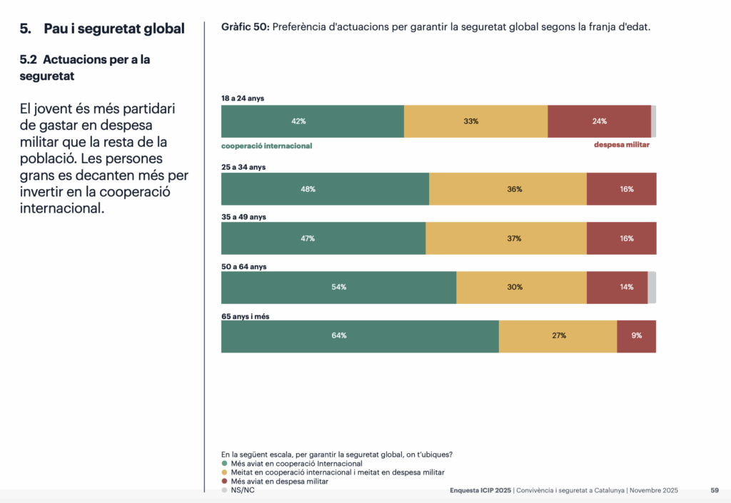 El Instituto Catalán Internacional por la Paz (ICIP) ha publicado un sondeo para analizar las percepciones respecto a la seguridad, la convivencia y la polarización política, entre otras cuestiones. Uno de los puntos más destacados es que los jóvenes de 18 a 24 años son los más partidarios de incrementar el gasto militar, mientras que las generaciones mayores apuestan en mayor medida por invertir en «cooperación internacional».