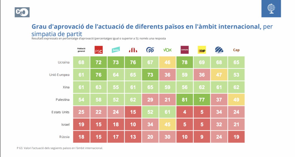 De acuerdo con el sondeo, el grado de aprobación de los votantes de Junts a Israel en el «ámbito internacional» es solo del 18%, mientras que hacia Palestina la aprobación es del 54%. Los votantes de Vox, Partido Popular y Aliança Catalana también suspenden a Israel, pero de un modo más matizado (con un 45%, 34% y 32% respectivamente). No obstante, a diferencia de Junts, los simpatizantes de estos tres partidos también suspenden a Palestina (21%, 29% y 37%).