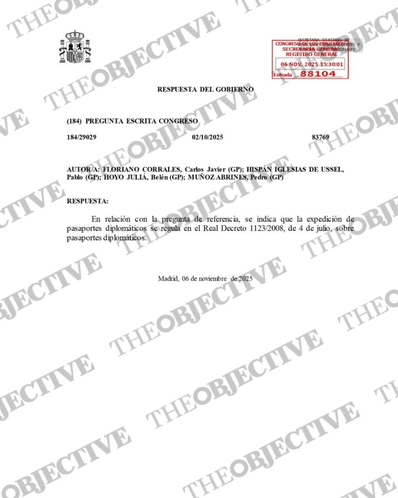 La respuesta ni siquiera intenta invocar razones legales para el silencio. No menciona seguridad nacional, no apela a protección de datos y no se escuda en reservas diplomáticas. Simplemente evita contestar. Y esa ausencia de explicación oficial confirma, de manera indirecta, el dato adelantado por THE OBJECTIVE: Koldo García tuvo un pasaporte diplomático.