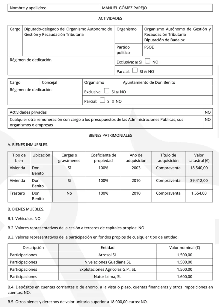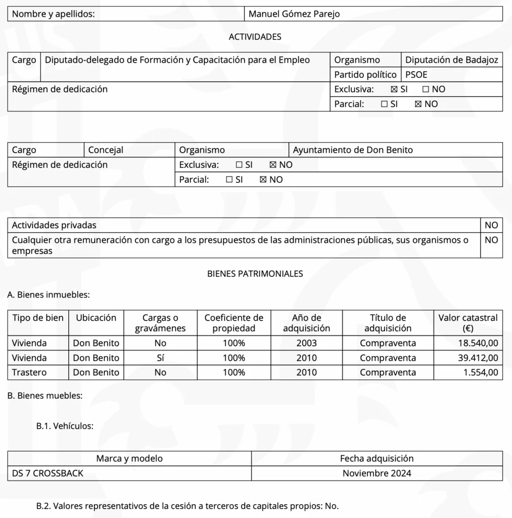 En las declaraciones de bienes que Gómez Parejo ha ido entregando a la Diputación de Badajoz en los últimos años no aparece dinero en cuentas bancarias ni vehículos en propiedad, un caso atípico entre los diputados provinciales. El único cambio relevante se produjo este año 2025, en el que comunicó la compra de un coche DS7 Crossback en noviembre del año pasado. Lo que ha permanecido invariable ha sido el porcentaje de acciones, tanto en Arrosol como en otras sociedades familiares.