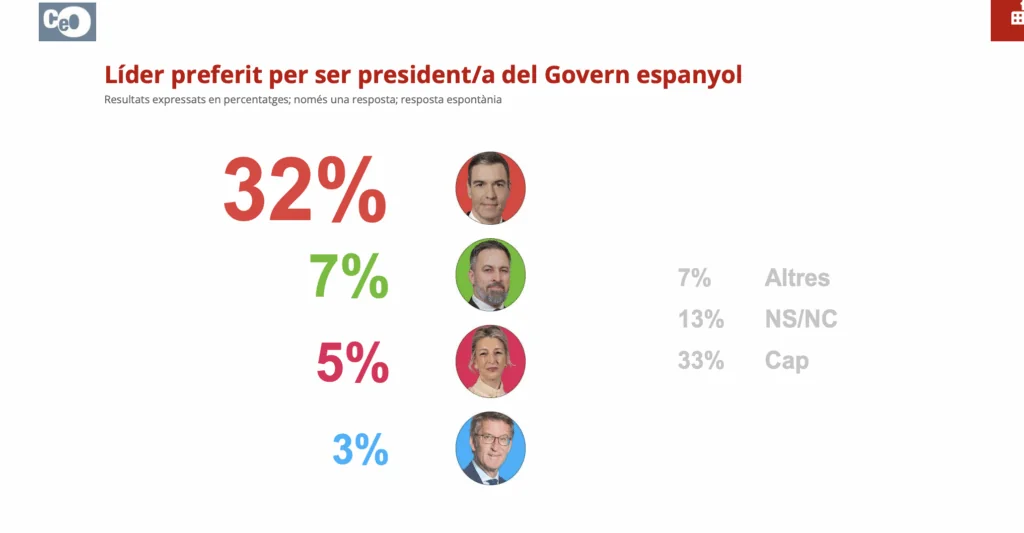 Además, el líder de Vox, Santiago Abascal, es más valorado por los catalanes como posible presidente del Gobierno. Si bien se queda en un 7%, supera tanto a Feijóo (3%) como a Yolanda Díaz, líder de Sumar (5%). El líder del PSOE, Pedro Sánchez, sigue siendo el gran preferido para dirigir el gobierno (32%).