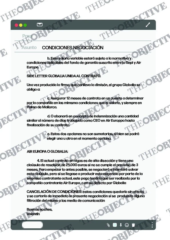 La ministra dejó claro que, para acceder al saldo pendiente, era imprescindible que la compañía incorporara al Consejo de Administración a una persona propuesta por la SEPI. Pocos días después de este encuentro, Valentín Lago, designado por el organismo público, remitió un correo electrónico a Ramiro Campos, jefe de los Servicios Jurídicos de Globalia, incluyendo en copia a José Ángel Partearroyo, director de Estrategia y Seguimiento de la SEPI. Bajo el asunto «Condiciones Negociación», Lago detallaba los términos de su contrato, que debían ser aceptados por Air Europa. En el mensaje escribía: «Estimado Ramiro: De acuerdo a las conversaciones mantenidas sobre la negociación de las condiciones de aceptación del puesto de CEO de Air Europa, te adjunto lo hablado sobre la base de las condiciones en las que se aceptaría el puesto».