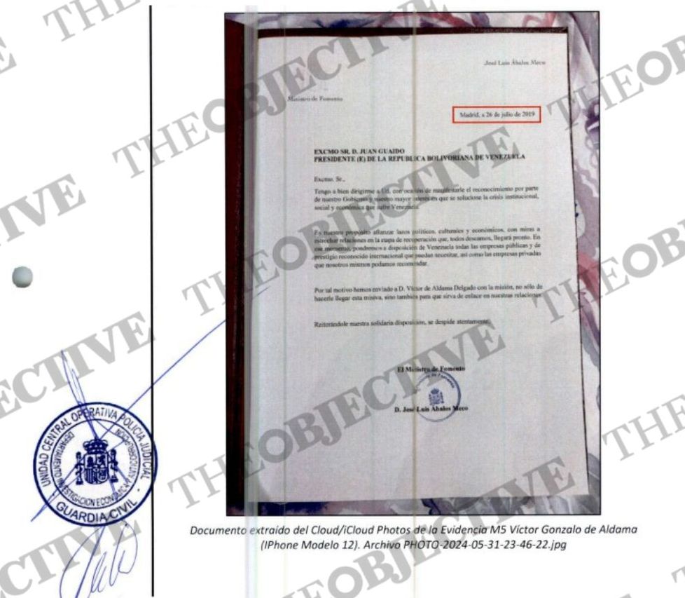 José Luis Ábalos envió al empresario Víctor de Aldama a Venezuela en verano de 2019 para entregar una carta a Juan Guaidó en la que le mostraba su apoyo como presidente encargado de la República y le ofrecía el apoyo de las empresas públicas españolas para la etapa de recuperación que estaba por llegar.