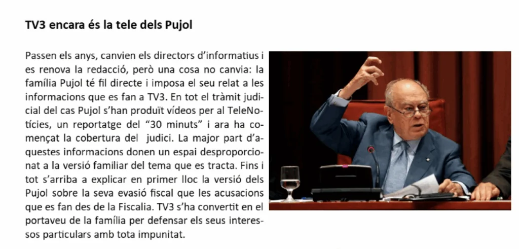 De acuerdo con este sindicato, «pasan los años, cambian los directores de informativos y se renueva la redacción, pero algo no cambia: la familia Pujol tiene hilo directo e impone su relato en las informaciones que se hacen en TV3». Y prosiguen: «En todo el trámite judicial del caso Pujol se han producido vídeos para el Telenotícies, un reportaje del programa 30 Minuts y ahora ha empezado toda la cobertura del juicio. La mayor parte de estas informaciones dan un espacio desproporcionado en la versión familiar del tema que se trata. Incluso se llega a explicar en primer lugar la versión de los Pujol sobre la evasión fiscal de que las acusaciones que se hacen desde la Fiscalía».