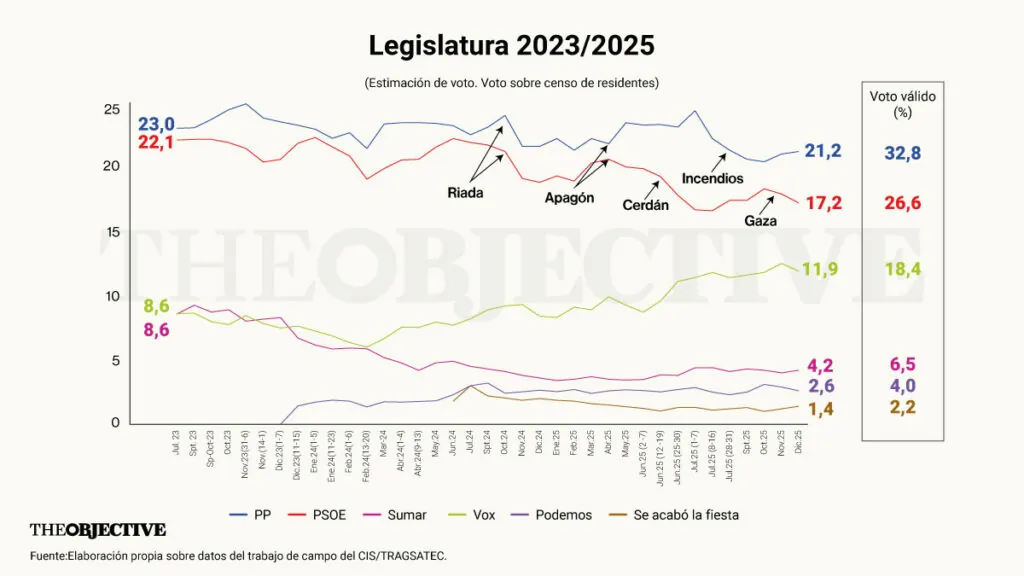 En diciembre han cambiado poco las estimaciones de voto respecto a noviembre, dado el bloqueo que provoca la tensión política. Los choques frontales compactan las posiciones, como las trincheras. Pero se mueven lo suficiente para que el PP amplíe su ventaja a un 6,2% en voto válido. En escaños, pocos cambios respecto al mes pasado, pero decisivos: el PP ganaría 5 (142) y Vox, 29. Habría una mayoría de centro derecha de 205 escaños, sumando uno de UPN. En el centro izquierda sería dramático: el PSOE perdería 18 escaños, hasta quedar en 103. Los 31 de Sumar se reducirían a 10 y 4 de Podemos. Junts, pasaría de 7 a 4.