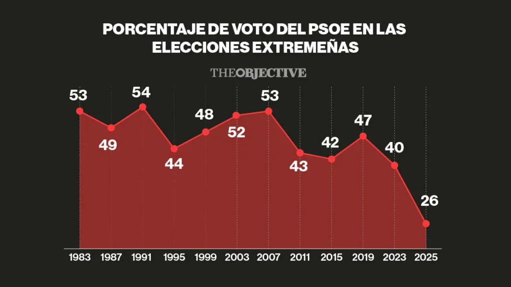 Una auténtica debacle. El PSOE se hundió electoralmente en la noche del 21 de diciembre en Extremadura. El primer candidato socialista procesado que concurre a unas elecciones, Miguel Ángel Gallardo, cosechó el mayor fracaso histórico del PSOE en Extremadura al dejarse 116.300 votos y diez escaños respecto a los resultados obtenidos por el PSOE en 2023. Un varapalo de enormes dimensiones tras el que se empezó a escuchar las primeras peticiones de dimisión de Gallardo: «Está tardando», decían dirigentes de la dirección a THE OBJECTIVE. «No le queda otra», replicaban dirigentes socialistas conscientes de la necesidad de un cortafuegos que tapone el incendio.