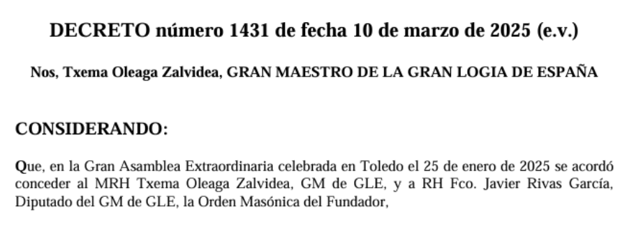 En los últimos meses, además, ha sido llamativa la concesión entre los miembros de la dirección de las medallas más importantes de la logia. El propio Oleaga firmó en marzo el decreto (a continuación) por el que se impuso la Orden Masónica del Fundador junto a su mano derecha, Francisco Javier Rivas. «No se sometió a votación y solo se aplaudió a la búlgara», recuerda uno de los asistentes sobre aquella propuesta llevada a pleno.