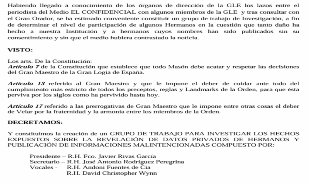 Los problemas internos de Oleaga afloraron en junio del año pasado, cuando El Confidencial desveló que políticos del PSOE habían copado en dos años los máximos cargos de la masonería en España. Aquella noticia desató una caza de brujas dentro de la logia con la puesta en marcha de una especie de tribunal inquisidor en el que se interrogó a los acusados de filtrar la noticia (a continuación). Las pesquisas para averiguar quiénes estaban detrás de la «publicación de informaciones malintencionadas» no aclararon de dónde habían salido, pero varios hermanos sospecharon entonces que el objetivo del gran maestro era «amedrentar a las posibles voces discordantes» que empezaban a despuntar dentro.