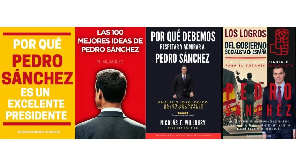Estos son algunos de los otros títulos que se pueden encontrar en el portal digital: Las 100 mejores ideas de Pedro Sánchez, de N. Blanco; POR QUÉ DEBEMOS RESPETAR Y ADMIRAR A PEDRO SÁNCHEZ: Análisis ideológico de un estadista extraordinario, por Nicolás T. Willbury; Los logros del socialismo en España: El libro imprescindible para el votante sanchista, por Francisco Jones Franco; o Por qué Pedro Sánchez es un excelente presidente, de Alessandro Agazzi, entre otros.