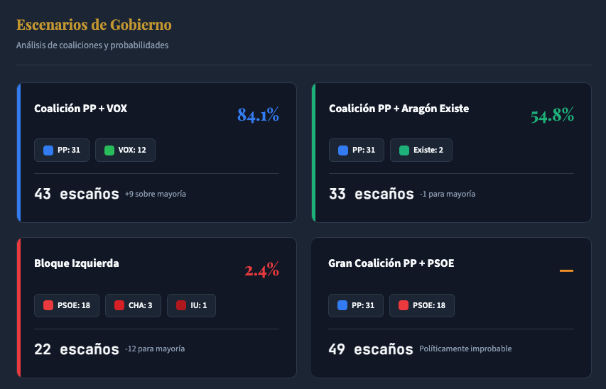Para minimizar el margen de error, el estudio somete estos datos a una simulación de Monte Carlo con 10.000 iteraciones, lo que permite examinar múltiples escenarios de volatilidad. Finalmente, la traducción de votos a escaños respeta escrupulosamente la realidad territorial de la comunidad, aplicando la fórmula D’Hondt por circunscripciones (Zaragoza, Huesca y Teruel) y la barrera electoral del 3%, determinando así la probabilidad matemática de que cada bloque alcance la mayoría absoluta de 34 diputados.