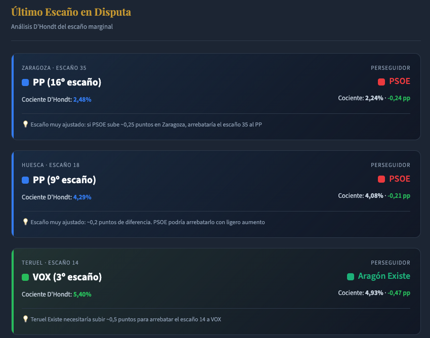 La proyección de Redlines deja claro que la batalla del 8 de febrero va a estar muy justa hasta el final. Más allá del dato concreto de lo que podría obtener cada partido en las elecciones autonómicas, el último escaño en disputa en cada circunscripción va a ser clave. ¿El motivo? Ahí puede estar la gobernabilidad de Azcón para no depender de Vox.