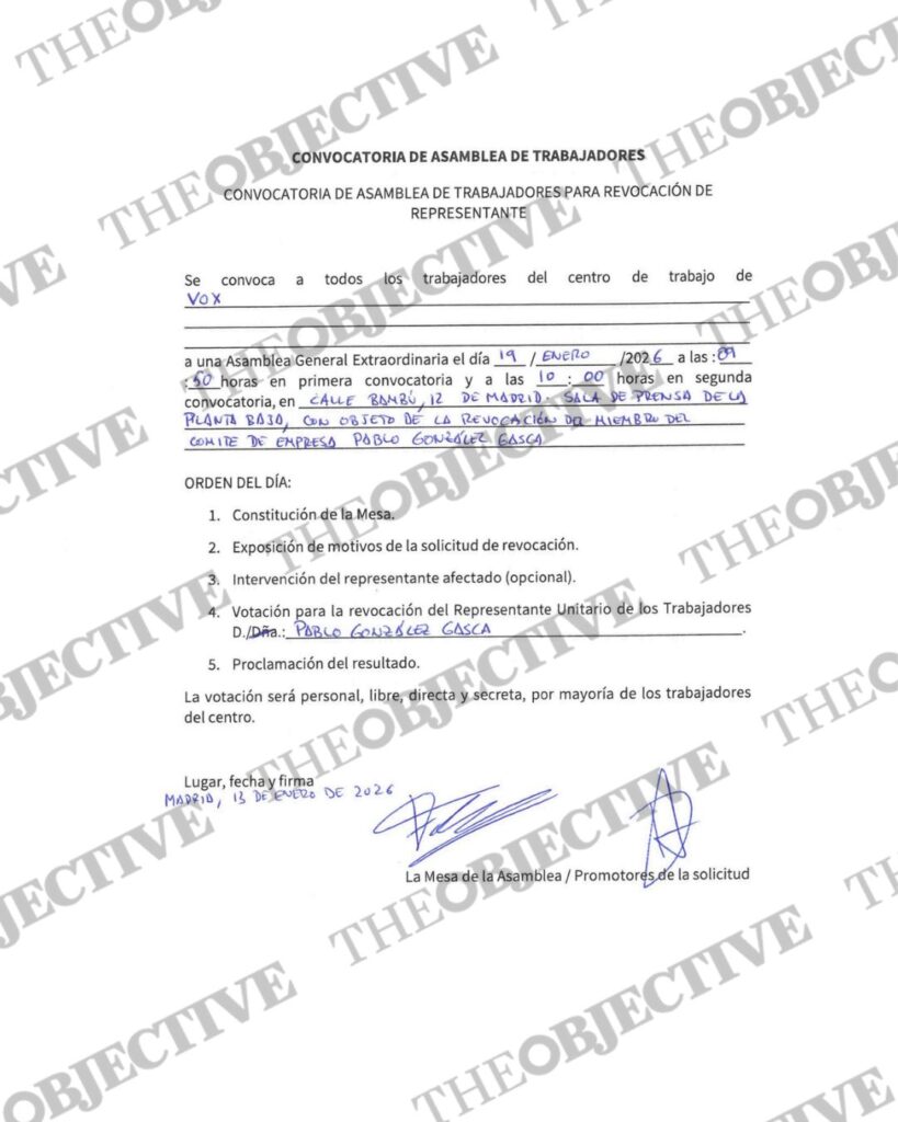 Gasca comunicó al partido el pasado viernes que no asistiría a la reunión y pidió que constara en acta una declaración a la que ha tenido acceso en exclusiva THE OBJECTIVE. En esta, el expulsado de Vox denuncia: la asamblea «ha sido realizada de forma unilateral, sin mi participación ni posibilidad de consenso en la fijación de la fecha, a pesar de tratarse de un procedimiento que afecta directa y personalmente a mi condición de representante legal de los trabajadores».