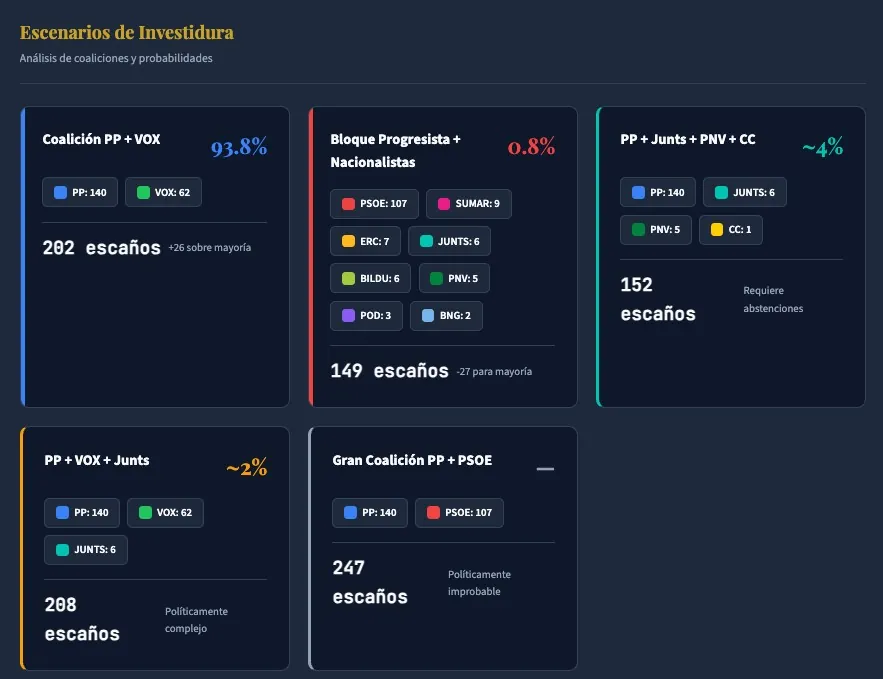 Con todo ello, y los 202 escaños que sumarían PP y Vox, ambas formaciones alcanzan un 93,8% de probabilidades de sacar adelante una investidura. Solo habría un 0,8% de posibilidades, algo muy improbable, de que se llegase a formar un gobierno entre el bloque progresista y los partidos nacionalistas. En cuanto a un posible gran bloque entre la suma de los populares y los socialistas, Redlines deja claro que es «políticamente improbable», por lo que ni entra en juego.