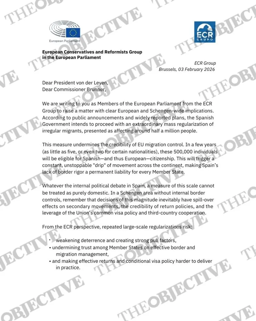 En la carta, los reformistas, a iniciativa de los eurodiputados españoles Diego Solier y Nora Junco, advierten a la Comisión Europea de que «el Gobierno español pretende llevar a cabo una regularización masiva extraordinaria de migrantes irregulares», lo que afectará a «alrededor de un millón de personas»: «Esta medida socava la credibilidad del control migratorio de la UE. En pocos años (tan solo cinco, o incluso dos para ciertas nacionalidades), estas personas podrían optar a la ciudadanía española y, por lo tanto, a la europea. Esto desencadenará un flujo constante e imparable de movimientos migratorios por todo el continente, convirtiendo la falta de rigor fronterizo de España en una carga permanente para todos los Estados miembros».