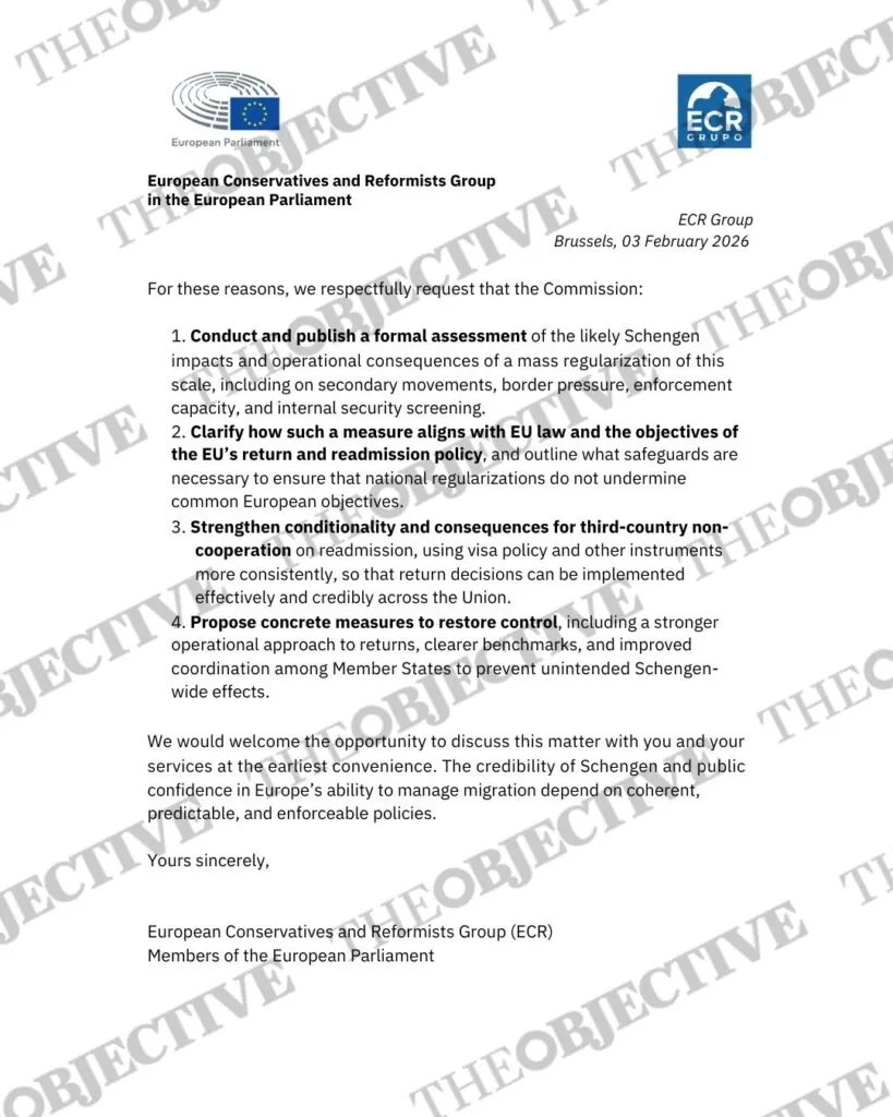Por lo expuesto, ECR propone a la Comisión Europea una «evaluación formal de los probables impactos y consecuencias operativas en Schengen de una regularización masiva de esta escala», «reforzar la condicionalidad y las consecuencias de la falta de cooperación de terceros países en materia de readmisión», así como «restablecer el control, incluyendo un enfoque operativo más sólido para los retornos, parámetros de referencia más claros y una mejor coordinación entre los Estados miembros para evitar efectos no deseados en todo el espacio Schengen». Asimismo, solicita un debate en Estrasburgo sobre la regularización exprés.