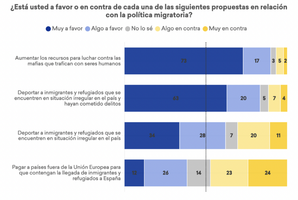 La mayoría de los españoles, según el sondeo confeccionado por la organización More In Common, considera que «la llegada de inmigrantes y refugiados a España y otros países es algo que no puede evitarse, solo puede controlarse y gestionarse». En este sentido, un 90% de la población española apoya el incremento de los recursos para luchar contra las mafias que trafican con seres humanos, un 83% apoya la deportación de inmigrantes en situación irregular que cometan delitos, y un 62% incluso si no los cometen.