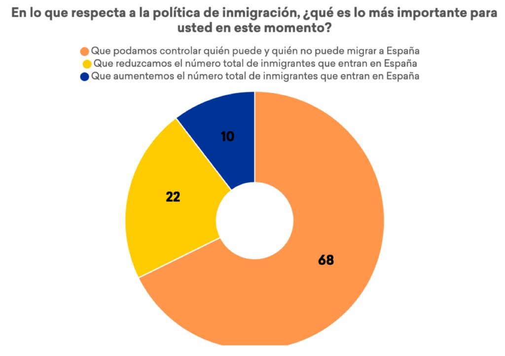 Por otro lado, el 22% considera urgente reducir el número de inmigrantes y solo un 10% quiere aumentarlos. Del mismo informe se extrae, además, que el 47% de la sociedad española piensa que la inmigración trae más costes que beneficios, un 33% considera que trae ambos a partes iguales y solo un 19% piensa que trae más beneficios que costes. Esta última opción no es la mayoritaria ni siquiera entre los votantes de Podemos.