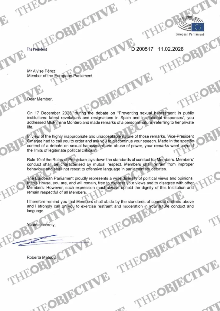 Roberta Metsola le reprocha ahora a Alvise, en una carta a la que ha tenido acceso THE OBJECTIVE, sus comentarios de carácter personal del pasado 17 de diciembre, «refiriéndose a la vida privada» de Montero. Además, le recuerda que dado el carácter «altamente inapropiado e inaceptable» de dichas declaraciones, el vicepresidente Omarjee «tuvo que llamarle al orden y solicitarle que interrumpiera su intervención».